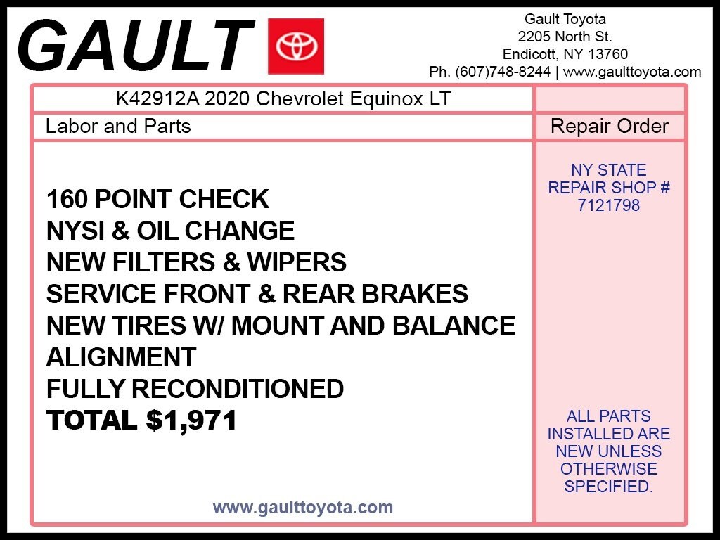 Discover the perfect blend of comfort, style, and efficiency with the 2020 Chevrolet Equinox LT, available now at Gault Toyota in Endicott, NY. This midsize SUV is powered by a 1.5L turbocharged engine, offering a smooth and fuel-efficient drive for both city commutes and weekend adventures. The Equinox LT features a sleek design with modern touches, including a power-adjustable drivers seat, a 7-inch touchscreen with Apple CarPlay and Android Auto, and key safety features like Blind Spot Monitoring and Rear Cross Traffic Alert. With spacious seating for up to five and ample cargo space, the 2020 Chevrolet Equinox LT is ideal for families and daily drivers alike. Visit Gault Toyota in Endicott, NY today to test drive this versatile and reliable SUV!