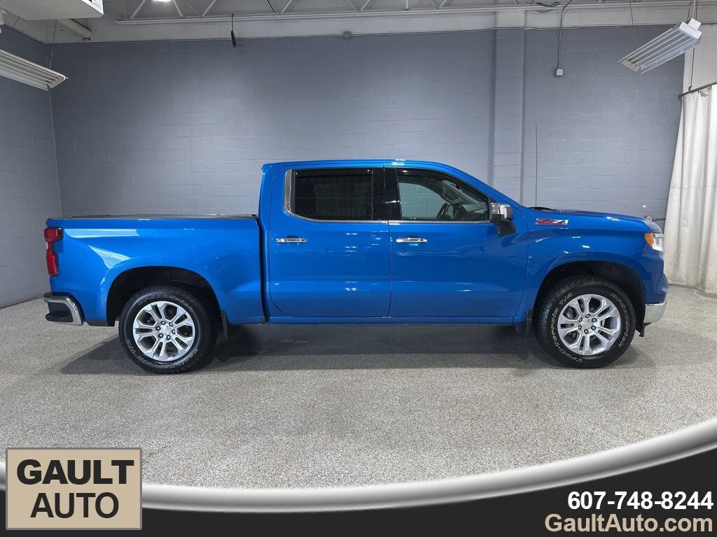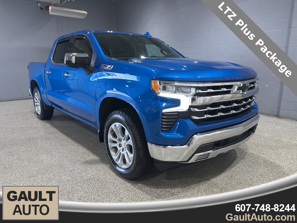 One Owner, Silverado 1500 LTZ, 4D Crew Cab, 3.0L I6, 10-Speed Automatic, 4WD, Glacier Blue Metallic, Jet Black Leather, 10-Way Power Driver Seat w/Lumbar, 10-Way Power Passenger Seat Adjuster w/Lumbar, 12.3" Multicolor Reconfigurable Digital Display, 120-Volt Bed Mounted Power Outlet, 120-Volt Instrument Panel Power Outlet, 15" Diagonal Multicolor Head-Up Display, 170 Amp Alternator, 2 USB Data Ports, 220 Amp Alternator, 2nd Row Heated Outboard Seats, 3.23 Rear Axle Ratio, 4-Wheel Disc Brakes, 6" Rectangular Chrome Tubular Assist Steps (LPO), 7 Speakers, ABS brakes, Adaptive Cruise Control, Air Conditioning, All-Weather Floor Liner (LPO) (AAK), Alloy wheels, AM/FM radio: SiriusXM with 360L, Apple CarPlay/Android Auto, Auto High-beam Headlights, Auto-dimming door mirrors, Auto-Dimming Inside Rear-View Mirror, Auto-dimming Rear-View mirror, Auto-Locking Rear Differential, Automatic Emergency Braking, Automatic temperature control, Auxiliary External Transmission Oil Cooler, Bed View Camera, Bluetooth® For Phone, Brake assist, Bumpers: chrome, Chevrolet Connected Access Capable, Chevytec Spray-On Black Bedliner, Chrome Mirror Caps, Color-Keyed Carpeting Floor Covering, Compass, Deep-Tinted Glass, Delay-off headlights, Driver door bin, Driver Memory, Driver vanity mirror, Dual Exhaust w/Polished Outlets, Dual front impact airbags, Dual front side impact airbags, Dual Rear USB Ports (Charge Only), Electric Rear-Window Defogger, Electrical Steering Column Lock, Electronic Cruise Control, Electronic Stability Control, Electronic Transmission Range Selector Shifter, Engine Block Heater, Floor Mounted Center Console, Following Distance Indicator, Forward Collision Alert, Front anti-roll bar, Front Black Bowtie Emblem (LPO), Front Bucket Seats, Front Center Armrest, Front dual zone A/C, Front fog lights, Front Frame-Mounted Black Recovery Hooks, Front LED Fog Lamps, Front License Plate Kit, Front Pedestrian Braking, Front Rainsensing Wipers, Front reading lights, Front Rubberized Vinyl Floor Mats, Front wheel independent suspension, Fully automatic headlights, Hard-Folding Tonneau Cover (LPO), HD Surround Vision, Heated door mirrors, Heated Driver & Front Outboard Passenger Seats, Heated front seats, Heated Steering Wheel, Heated steering wheel, Heavy-Duty Air Filter, High Capacity Suspension Package, Hill Descent Control, Hitch Guidance, Hitch Guidance w/Hitch View, Illuminated entry, Integrated Trailer Brake Controller, IntelliBeam Automatic High Beam On/Off, Keyless Open & Start, Lane Keep Assist w/Lane Departure Warning, Leather Wrapped Steering Wheel, LED Cargo Area Lighting, Low tire pressure warning, LTZ Convenience Package, LTZ Convenience Package II, LTZ Plus Package, Memory seat, Not Equip w/Ventilated Seat Cushion Blower Motor, Not Equipped w/Steering Column Lock, Occupant sensing airbag, Off-Road Suspension, OnStar & Chevrolet Connected Services Capable, Outside Heated Power-Adjustable Mirrors, Outside temperature display, Overhead airbag, Overhead console, Panic alarm, Passenger door bin, Passenger vanity mirror, Perforated Leather-Appointed Front Seat Trim, Perimeter Lighting, Power door mirrors, Power driver seat, Power Front Passenger Windows w/Express Up/Down, Power Front Windows w/Driver Express Up/Down, Power passenger seat, Power Rear Windows w/Express Down, Power Sliding Rear Window w/Rear Defogger, Power steering, Power Tailgate, Power Tilt & Telescoping Steering Column, Power windows, Preferred Equipment Group 1LZ, Premium audio system: Chevrolet Infotainment 3 Premium, Premium Bose 7-Speaker Sound System, Radio data system, Radio: Chevrolet Infotainment 3 Premium System, Rain sensing wipers, Rear Camera Mirror, Rear Cross Traffic Alert-Braking, Rear Pedestrian Detection, Rear reading lights, Rear Rubberized-Vinyl Floor Mats, Rear seat center armrest, Rear step bumper, Rear Wheelhouse Liners, Rear window defroster, Remote keyless entry, Remote Vehicle Starter System, Safety Alert Seat, Safety Package, Security sy