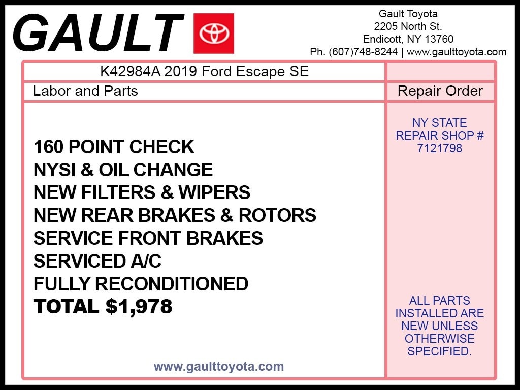 Discover the 2019 Ford Escape SE at Gault Toyota in Endicott, NY. This versatile SUV features a comfortable interior, advanced technology, and Ford Co-Pilot360 safety features for confident driving. Ideal for commuting or weekend adventures, the Escape SE delivers efficiency, reliability, and style. Visit Gault Toyota near Binghamton today to test drive the 2019 Ford Escape SE.