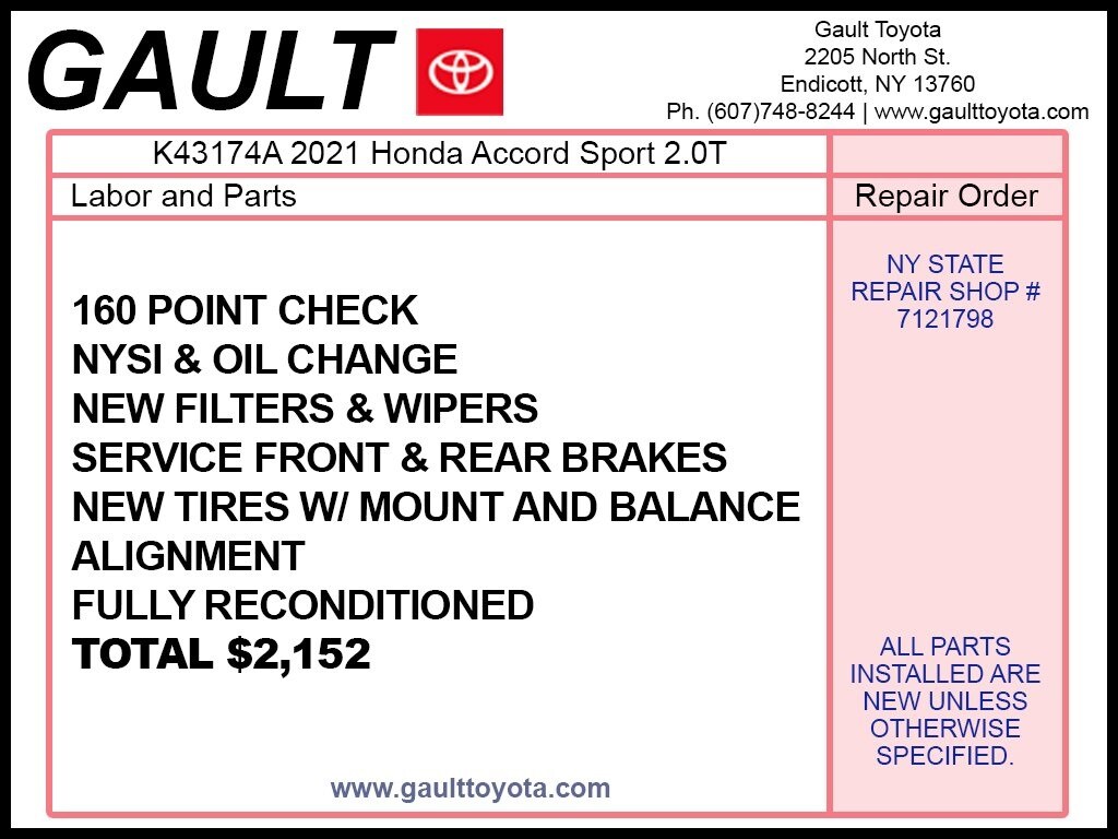 - Discover the 2021 Honda Accord Sport 2.0T at Gault Toyota in Endicott NY a sporty and reliable midsize sedan that delivers impressive performance and advanced technology. Powered by a turbocharged 2.0L engine the Accord Sport 2.0T offers responsive handling smooth acceleration and excellent fuel efficiency. Inside enjoy a driver-focused cabin with a touchscreen infotainment system Apple CarPlay and Android Auto premium materials and Honda Sensing safety features for added peace of mind. With its sleek styling comfort and versatility the 2021 Honda Accord Sport 2.0T is perfect for daily commuting and weekend adventures. Visit Gault Toyota in Endicott NY to experience this dynamic sedan today.