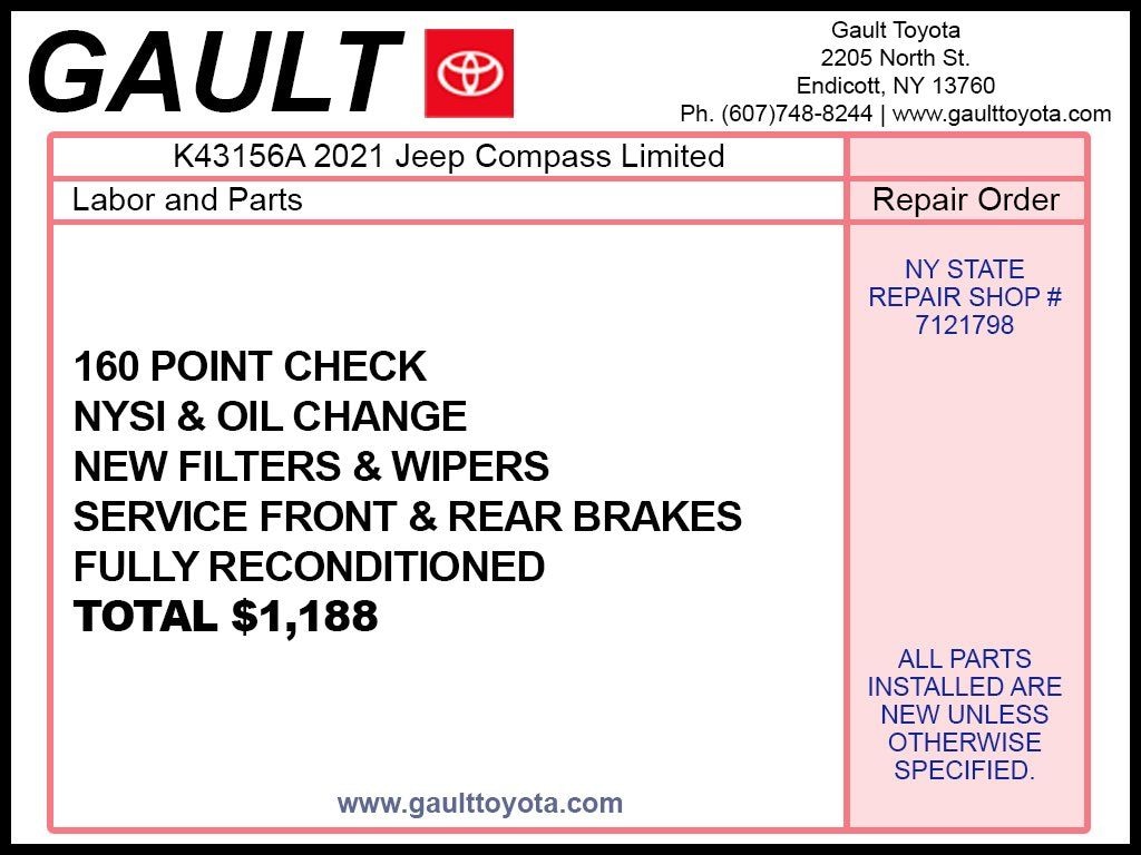 Explore the 2021 Jeep Compass Limited at Gault Toyota in Endicott, NY, a stylish and capable compact SUV built for both city streets and off-road adventures. Featuring a refined interior, advanced safety technology, and modern infotainment, the Compass Limited delivers comfort, convenience, and confidence on every drive. With its versatile cargo space, all-wheel drive capability, and sleek design, its perfect for daily commutes, weekend trips, and outdoor exploration. Visit Gault Toyota in Endicott to test drive the 2021 Jeep Compass Limited today.