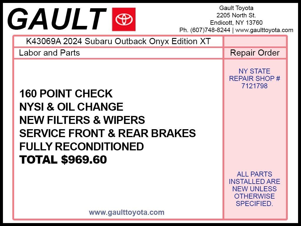The 2024 Subaru Outback Onyx Edition XT at Gault Toyota in Endicott NY combines rugged capability with refined comfort and advanced technology. Powered by a turbocharged 2.4L BOXER engine with Subaru Symmetrical All-Wheel Drive, this Outback delivers confident performance on any terrain. The Onyx Edition XT stands out with blacked-out exterior accents, unique 18-inch alloy wheels, and a water-repellent interior designed for adventure. Inside, youll enjoy a large touchscreen infotainment system with Apple CarPlay and Android Auto, plus advanced safety features from Subaru EyeSight Driver Assist Technology. Explore the 2024 Subaru Outback Onyx Edition XT today at Gault Toyota in Endicott NY.