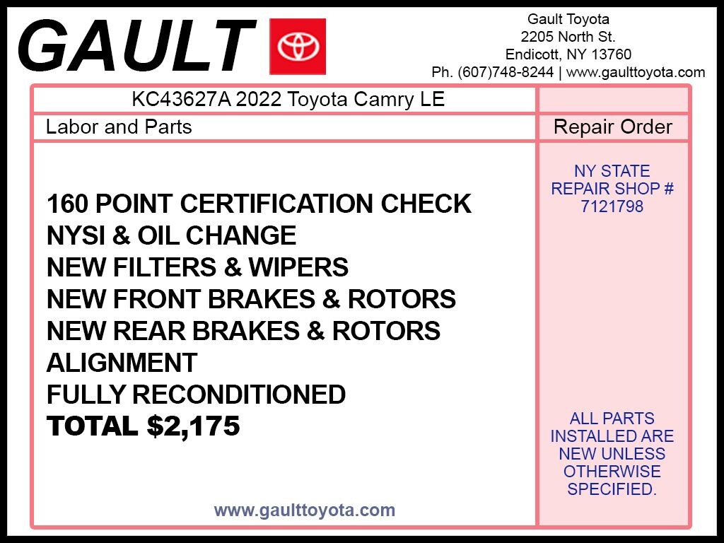 At Gault Toyota, we take pride in providing our customers with a hassle-free and transparent buying experience. This 2022 Toyota Camry LE is priced at just $23,500, representing an exceptional value in the pre-owned market. With its low mileage of 73,915 and comprehensive vehicle history report, you can drive with confidence knowing this Camry has been well-maintained.
