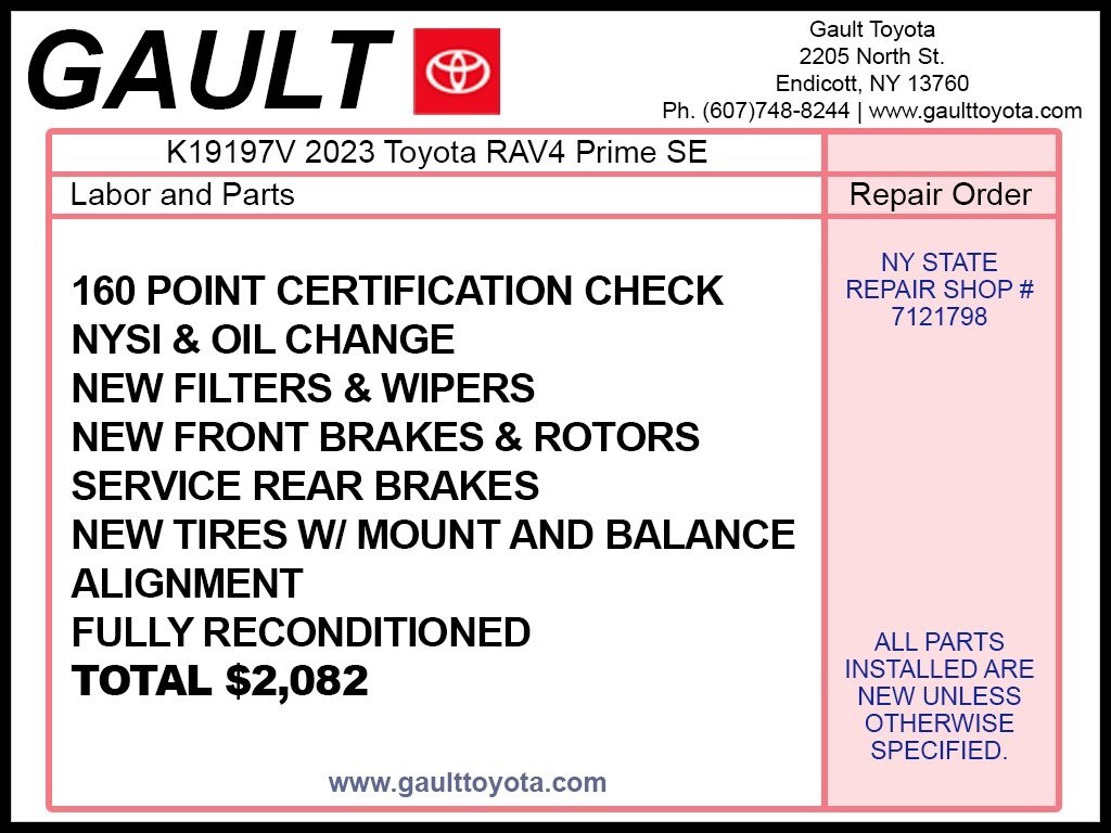 Discover the power and efficiency of the 2023 Toyota RAV4 Prime SE, available at Gault Toyota in Endicott, NY. This plug-in hybrid SUV delivers exceptional fuel economy, impressive electric range, and spirited performance with standard all-wheel drive. Inside, enjoy advanced tech, Toyota Safety Sense, and versatile cargo space for every adventure. Visit Gault Toyota near Binghamton to test drive the 2023 RAV4 Prime SE today.