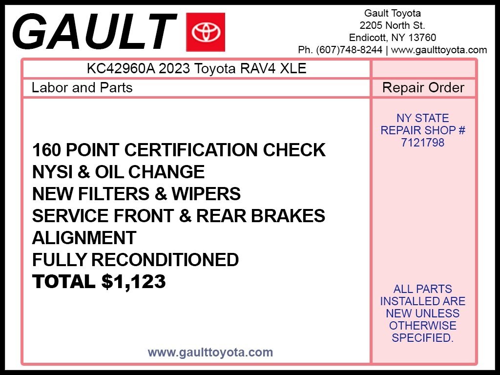 Discover the 2023 Toyota RAV4 XLE at Gault Toyota in Endicott, NY. This versatile SUV features a 2.5L 4-cylinder engine, spacious interior, and advanced technology for a connected and comfortable ride. With Toyota Safety Sense 2.5+ offering lane departure alert, pre-collision system, and more, the RAV4 XLE provides confidence on every drive. Perfect for daily commutes or weekend adventures, visit Gault Toyota today to test drive the 2023 RAV4 XLE.