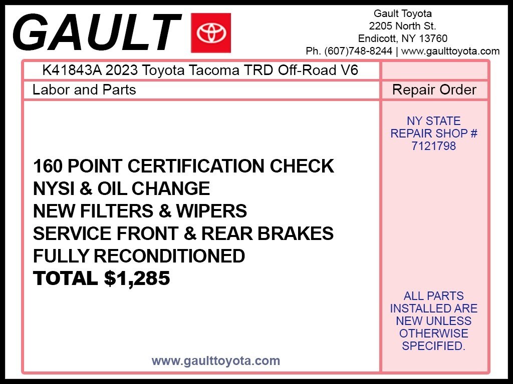 Conquer any terrain in the 2023 Toyota Tacoma TRD Off-Road V6, available now at Gault Toyota in Endicott, NY. Built for adventure, this rugged midsize truck features a powerful V6 engine, advanced off-road suspension, and Multi-Terrain Select for ultimate control on challenging trails. Inside, enjoy modern tech, Toyota Safety Sense, and versatile cargo capability. Visit Gault Toyota near Binghamton to test drive the 2023 Tacoma TRD Off-Road V6 today.